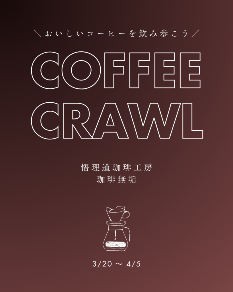 2026年3月20日から4月5日の期間【COFFEE CRAWL】と題しまして、当店「悟理道珈琲工房」と先日嘉右衛門町にオープンした「珈琲無垢」でコーヒーの飲み歩き企画を開催いたします。